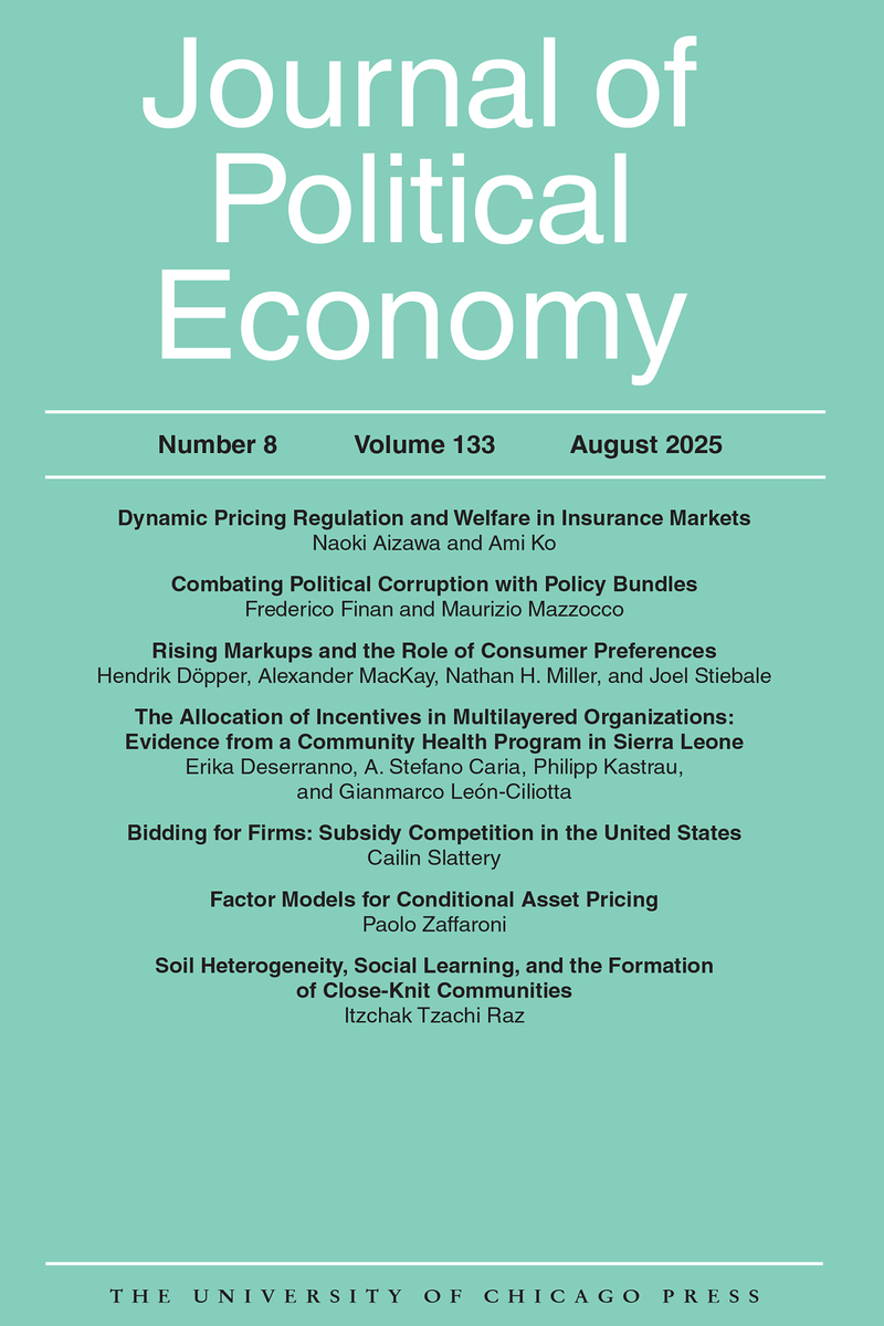 ABOUT THIS BOOKThis is volume 133 issue 8 of Journal of Political Economy. One of the oldest and most prestigious journals in economics, the Journal of Political Economy presents significant and essential scholarship in economic theory and practice. The journal publishes highly selective and widely cited analytical, interpretive, and empirical studies in a number of areas, including monetary theory, fiscal policy, labor economics, development, microeconomic and macroeconomic theory, international trade and finance, industrial organization, and social economics.