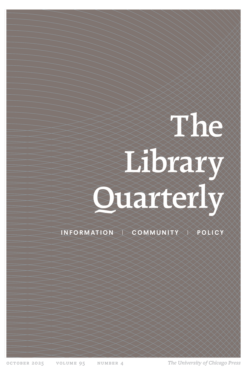 ABOUT THIS BOOKThis is volume 95 issue 4 of The Library Quarterly. The Library Quarterly (LQ) embraces a wide array of original research perspectives, approaches, and quantitative, qualitative, evaluative, analytic, and mixed methodology to assess the role of libraries in communities and in society. Through unique and innovative content that positions libraries at the nexus of information, community, and policy, LQ publishes cutting-edge articles, essays, editorials, and reviews that inform, enable, equalize, and lead. Across these areas, all content in the journal ties to contemporary issues impacting libraries and librarianship.