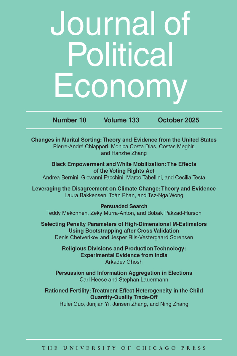ABOUT THIS BOOKThis is volume 133 issue 10 of Journal of Political Economy. One of the oldest and most prestigious journals in economics, the Journal of Political Economy presents significant and essential scholarship in economic theory and practice. The journal publishes highly selective and widely cited analytical, interpretive, and empirical studies in a number of areas, including monetary theory, fiscal policy, labor economics, development, microeconomic and macroeconomic theory, international trade and finance, industrial organization, and social economics.