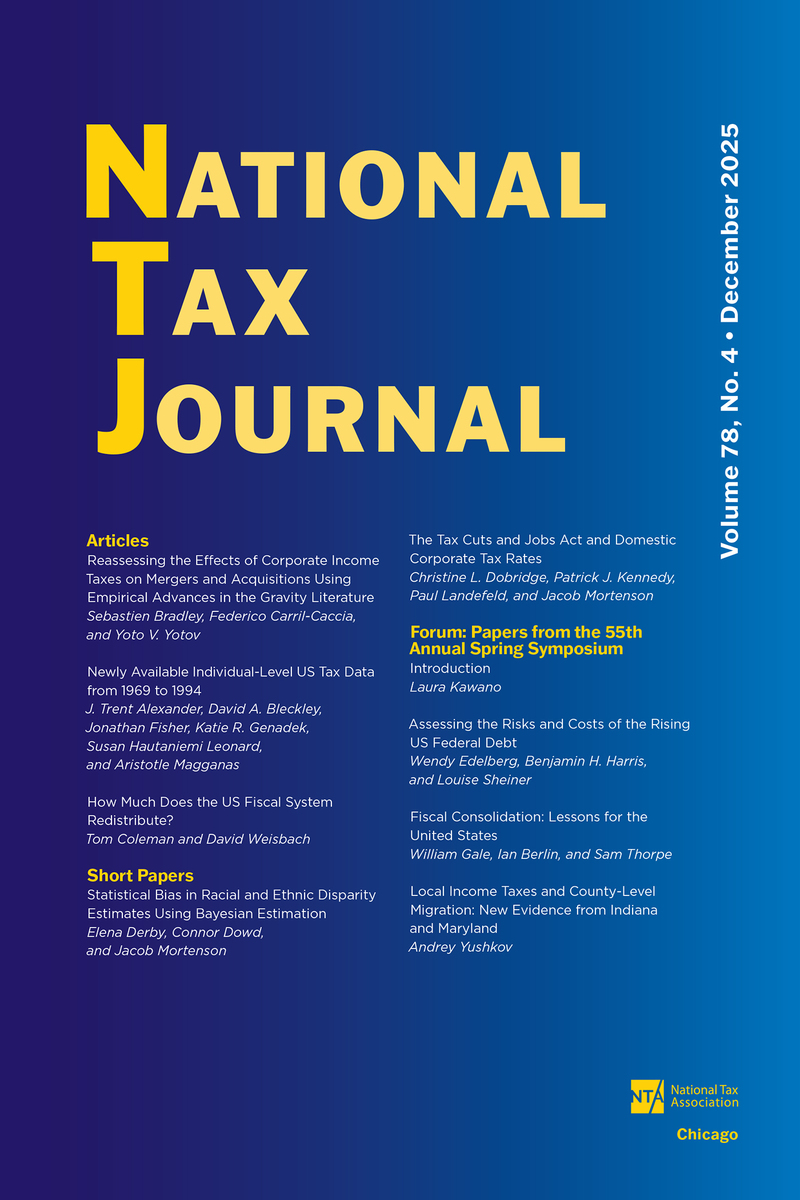 ABOUT THIS BOOKThis is volume 78 issue 4 of National Tax Journal. The goal of the National Tax Journal (NTJ) is to encourage and disseminate high quality original research on governmental tax and expenditure policies. The journal publishes peer reviewed articles that include economic, theoretical, and empirical analyses of tax and expenditure issues with an emphasis on policy implications. Each issue includes a Forum, which consists of invited papers by leading scholars that examine in depth a single current tax or expenditure policy issue. The NTJ has been published quarterly since 1948 under the auspices of the National Tax Association (NTA).