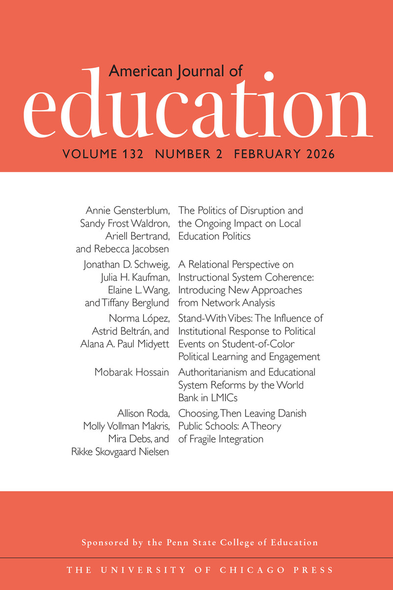 ABOUT THIS BOOKThis is volume 132 issue 2 of American Journal of Education. The American Journal of Education seeks to bridge and integrate the intellectual, methodological, and substantive diversity of educational scholarship and to encourage a vigorous dialogue between educational scholars and policy makers. It publishes empirical research, from a wide range of traditions, that contributes to the development of knowledge across the broad field of education.