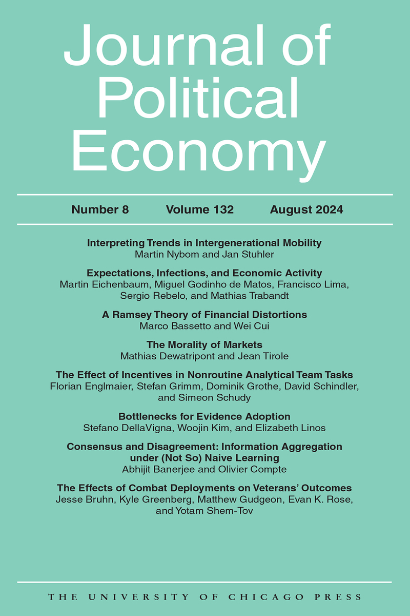 ABOUT THIS BOOKThis is volume 132 issue 8 of Journal of Political Economy. One of the oldest and most prestigious journals in economics, the Journal of Political Economy presents significant and essential scholarship in economic theory and practice. The journal publishes highly selective and widely cited analytical, interpretive, and empirical studies in a number of areas, including monetary theory, fiscal policy, labor economics, development, microeconomic and macroeconomic theory, international trade and finance, industrial organization, and social economics.