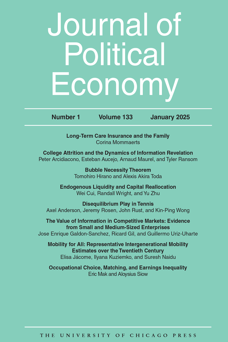 ABOUT THIS BOOKThis is volume 133 issue 1 of Journal of Political Economy. One of the oldest and most prestigious journals in economics, the Journal of Political Economy presents significant and essential scholarship in economic theory and practice. The journal publishes highly selective and widely cited analytical, interpretive, and empirical studies in a number of areas, including monetary theory, fiscal policy, labor economics, development, microeconomic and macroeconomic theory, international trade and finance, industrial organization, and social economics.