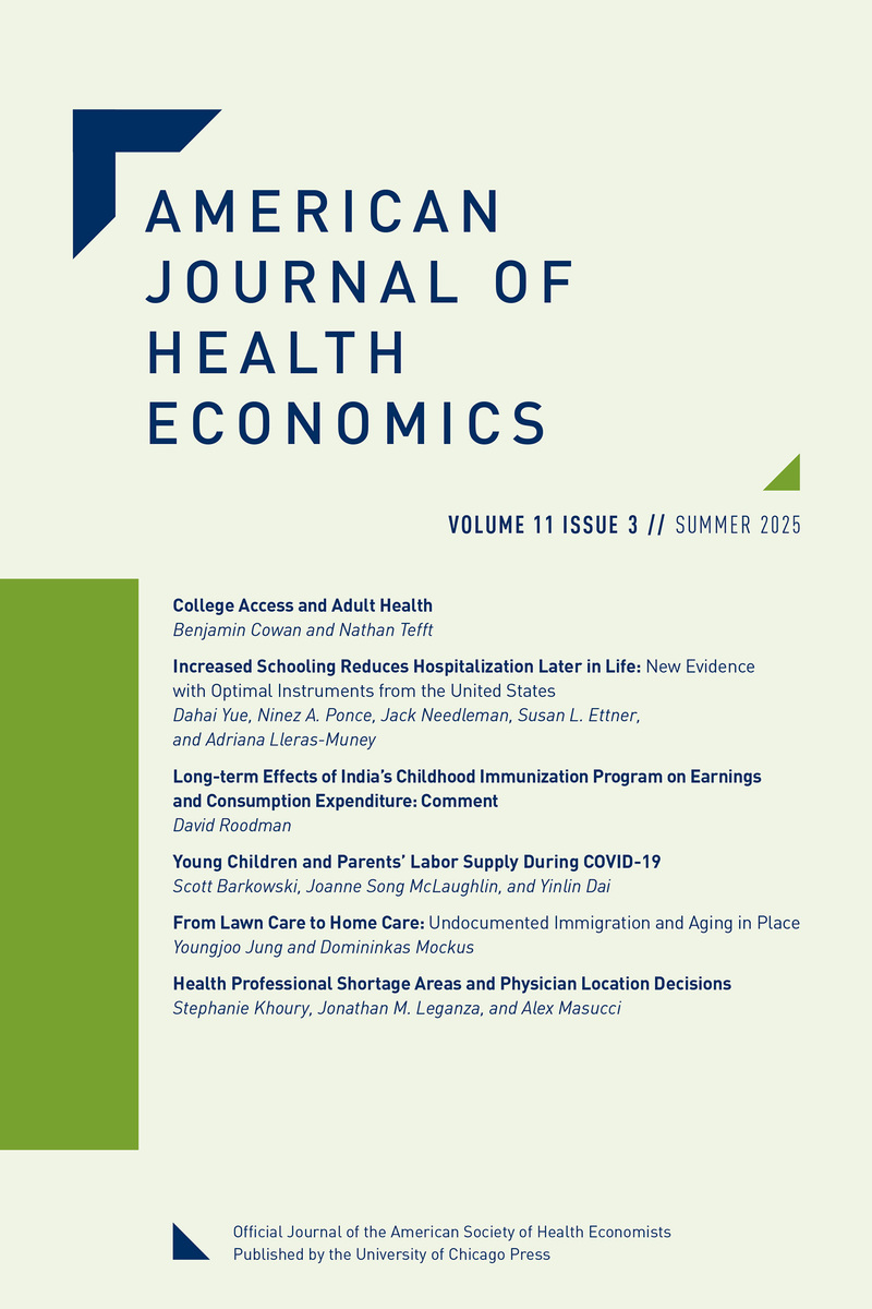 ABOUT THIS BOOKThis is volume 11 issue 3 of American Journal of Health Economics. The American Journal of Health Economics (AJHE) provides a forum for the in-depth analysis of health care markets and individual health behaviors. The articles appearing in AJHE are authored by scholars from universities, private research organizations, government, and industry. Subjects of interest include competition among private insurers, hospitals, and physicians; impacts of public insurance programs; pharmaceutical innovation and regulation; medical device supply; the rise of obesity and its consequences; the influence and growth of aging populations; and much more. The journal is published for the American Society of Health Economists (ASHEcon), which is a professional, non-profit organization dedicated to promoting excellence in health economics research in the United States.