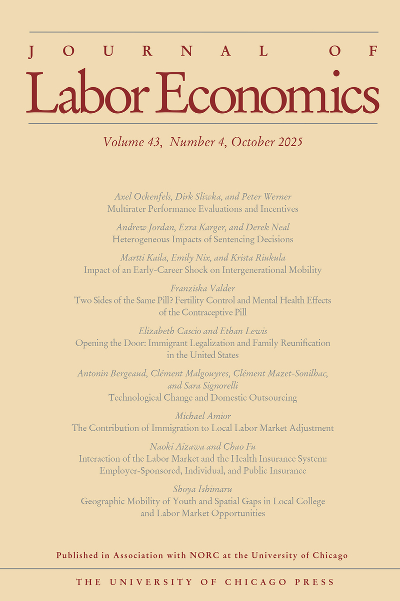 ABOUT THIS BOOKThis is volume 43 issue 4 of Journal of Labor Economics. Founded in 1983 as the first journal devoted specifically to labor economics, the Journal of Labor Economics (JOLE) presents international research on issues affecting social and private behavior, and the economy. JOLE’s contributors investigate various aspects of labor economics, including supply and demand of labor services, personnel economics, distribution of income, unions and collective bargaining, applied and policy issues in labor economics, and labor markets and demographics.