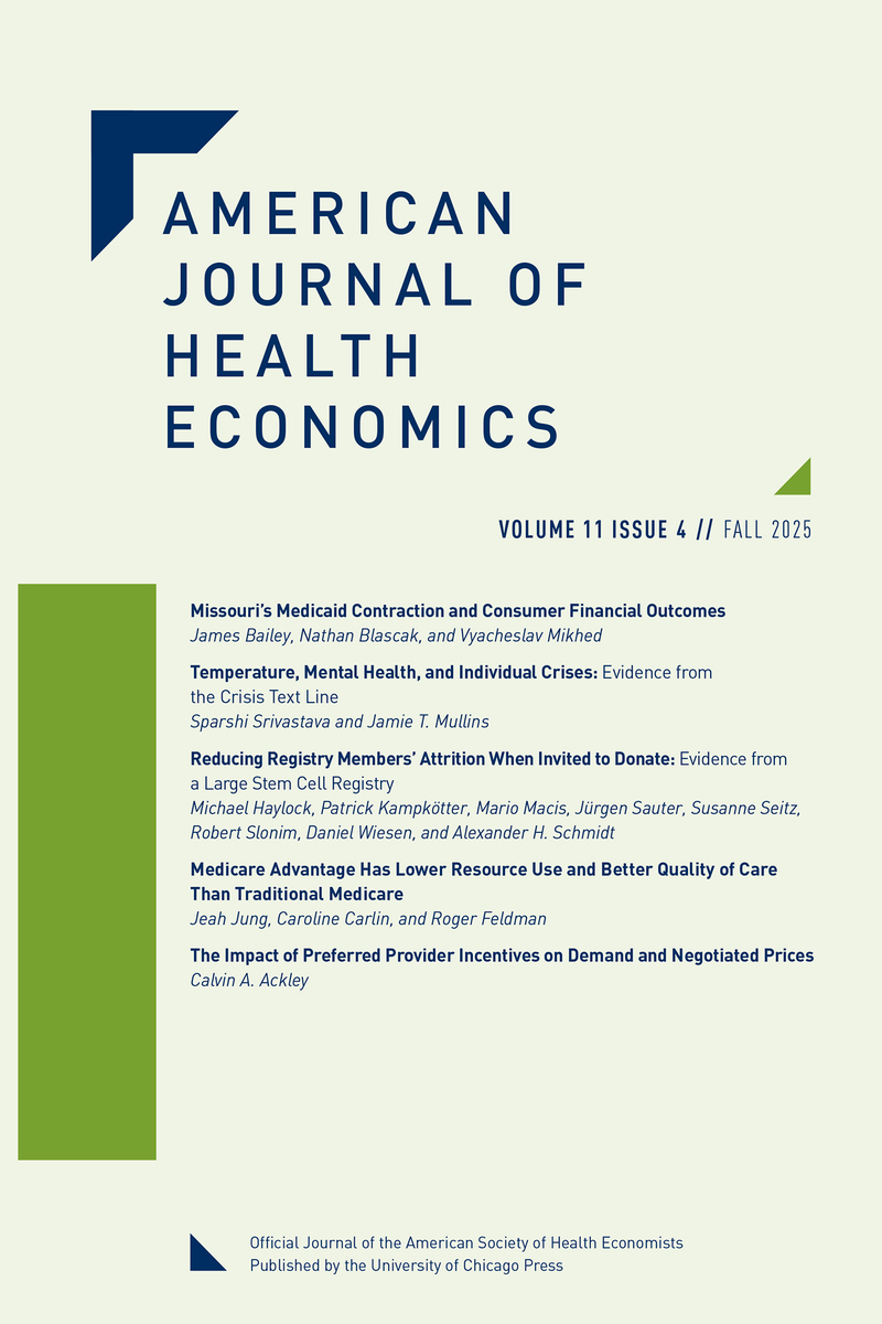 ABOUT THIS BOOKThis is volume 11 issue 4 of American Journal of Health Economics. The American Journal of Health Economics (AJHE) provides a forum for the in-depth analysis of health care markets and individual health behaviors. The articles appearing in AJHE are authored by scholars from universities, private research organizations, government, and industry. Subjects of interest include competition among private insurers, hospitals, and physicians; impacts of public insurance programs; pharmaceutical innovation and regulation; medical device supply; the rise of obesity and its consequences; the influence and growth of aging populations; and much more. The journal is published for the American Society of Health Economists (ASHEcon), which is a professional, non-profit organization dedicated to promoting excellence in health economics research in the United States.