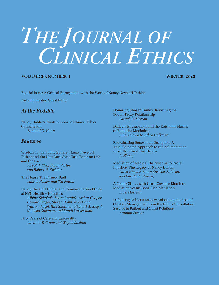ABOUT THIS BOOKThis is volume 36 issue 4 of The Journal of Clinical Ethics. The Journal of Clinical Ethics is uniquely focused on ethical issues that arise in direct patient care, in the clinic and at the bedside, as well as with related issues and challenges in the broader practice of medicine, healthcare delivery, and best practices. The journal engages with issues of primary concern to physicians and patients—and families—and all members of the clinical team, including allied professionals in ethics consultation, as well as scholars and professionals in diverse disciplines and care-related practices: philosophy, law, theology, public and health policy, nursing, and organizational ethics.