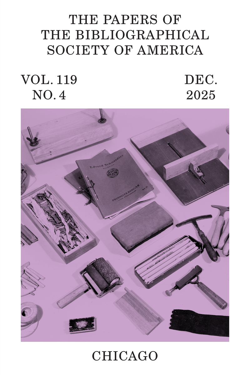 ABOUT THIS BOOKThis is volume 119 issue 4 of The Papers of the Bibliographical Society of America. Published on behalf of the oldest scholarly society in North America dedicated to the study of books and other textual artifacts in traditional and emerging formats, The Papers of the Bibliographical Society of America contains articles on book and manuscript production, publication, distribution, collecting, and reading in all periods, geographical regions, and media, as well as editorial and textual scholarship across all disciplines. The journal publishes original articles, book reviews, bibliographical notes, and review essays.