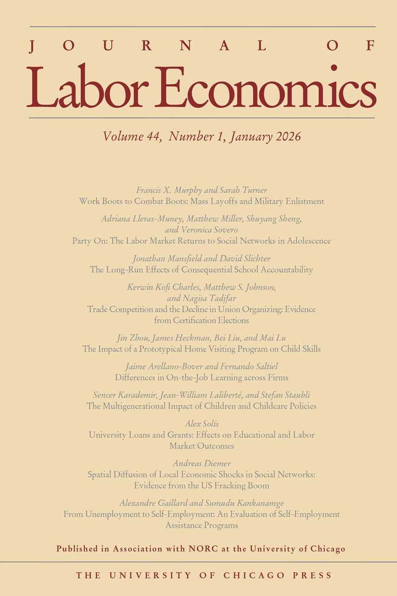ABOUT THIS BOOKThis is volume 44 issue 1 of Journal of Labor Economics. Founded in 1983 as the first journal devoted specifically to labor economics, the Journal of Labor Economics (JOLE) presents international research on issues affecting social and private behavior, and the economy. JOLE’s contributors investigate various aspects of labor economics, including supply and demand of labor services, personnel economics, distribution of income, unions and collective bargaining, applied and policy issues in labor economics, and labor markets and demographics.