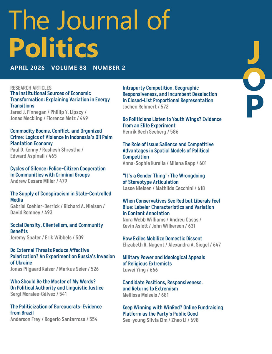 ABOUT THIS BOOKThis is volume 88 issue 2 of The Journal of Politics. Established in 1939 and published for the Southern Political Science Association, The Journal of Politics is a leading general-interest journal of political science and the oldest regional political science journal in the United States. The scholarship published in The Journal of Politics is theoretically innovative and methodologically diverse, and comprises a blend of the various intellectual approaches that make up the discipline. The Journal of Politics features balanced treatments of research from scholars around the world, in all subfields of political science including American politics, comparative politics, international relations, political theory, and political methodology.