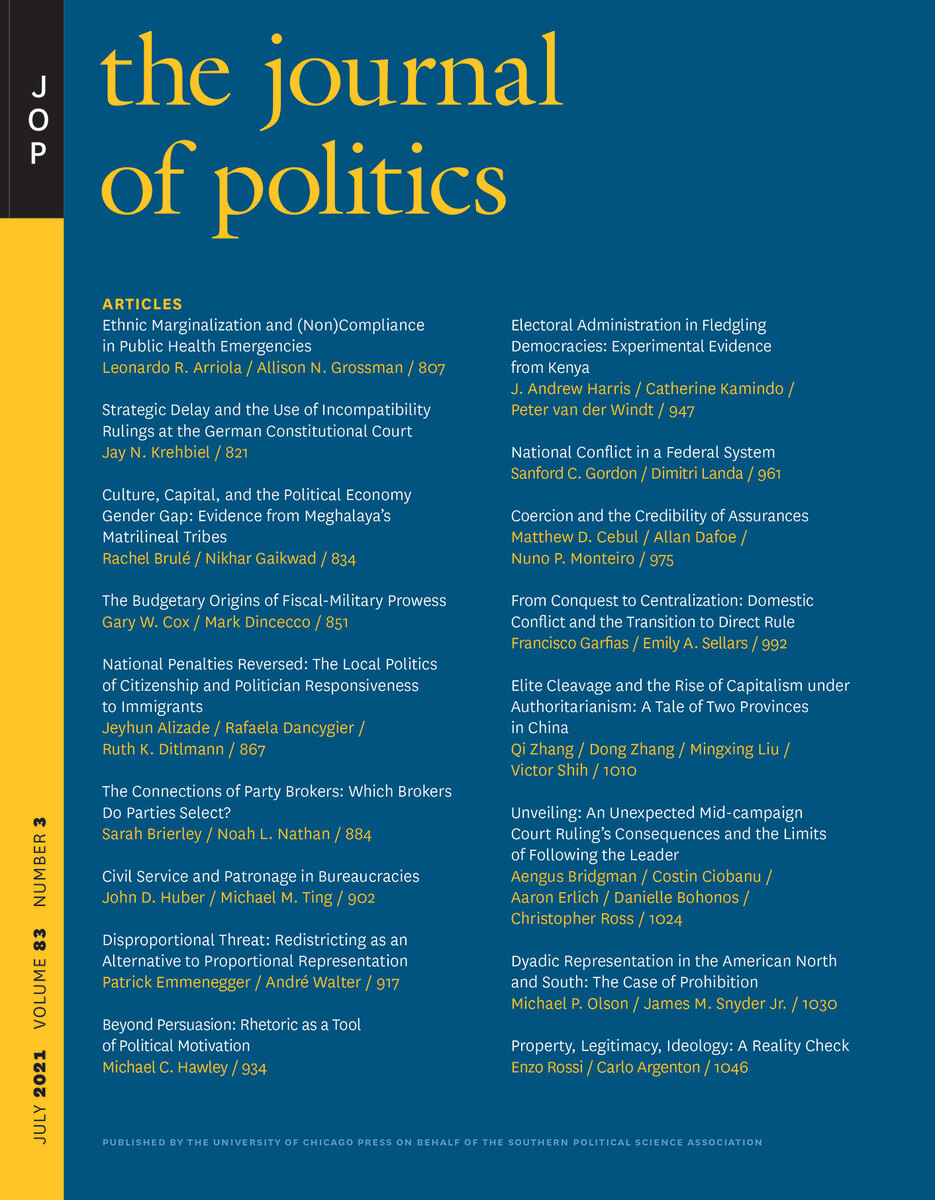 ABOUT THIS BOOKThis is volume 83 issue 3 of The Journal of Politics. Established in 1939 and published for the Southern Political Science Association, The Journal of Politics is a leading general-interest journal of political science and the oldest regional political science journal in the United States. The scholarship published in The Journal of Politics is theoretically innovative and methodologically diverse, and comprises a blend of the various intellectual approaches that make up the discipline. The Journal of Politics features balanced treatments of research from scholars around the world, in all subfields of political science including American politics, comparative politics, international relations, political theory, and political methodology.