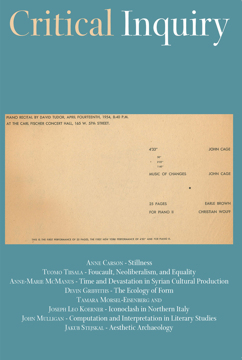 ABOUT THIS BOOKThis is volume 48 issue 1 of Critical Inquiry. Critical Inquiry is a peer-reviewed interdisciplinary journal devoted to the best critical thought in the arts and humanities. Combining a commitment to rigorous scholarship with a vital concern for dialogue and debate, the journal presents articles by eminent and emerging scholars, critics, and artists on a wide variety of issues in contemporary criticism and culture. Associated with no single school of thought, tied to no single discipline, Critical Inquiry is dedicated to providing a forum for cutting-edge thought while reconsidering traditional concepts and practices.