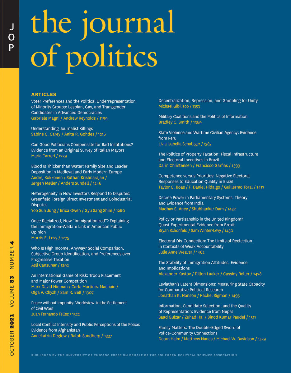 ABOUT THIS BOOKThis is volume 83 issue 4 of The Journal of Politics. Established in 1939 and published for the Southern Political Science Association, The Journal of Politics is a leading general-interest journal of political science and the oldest regional political science journal in the United States. The scholarship published in The Journal of Politics is theoretically innovative and methodologically diverse, and comprises a blend of the various intellectual approaches that make up the discipline. The Journal of Politics features balanced treatments of research from scholars around the world, in all subfields of political science including American politics, comparative politics, international relations, political theory, and political methodology.