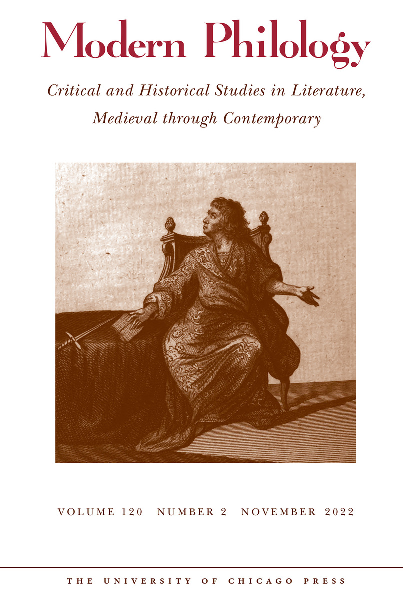 ABOUT THIS BOOKThis is volume 120 issue 2 of Modern Philology. Modern Philology (MP) publishes original work in literary criticism, literary history, and archival scholarship. The journal welcomes contributions on literature in all modern world languages and encourages productive comparisons of texts and traditions from any part of the world. It accepts essays that focus on earlier periods as well as the present. MP also aims to publish timely review articles, reviews of recent books, and research on archival documents.