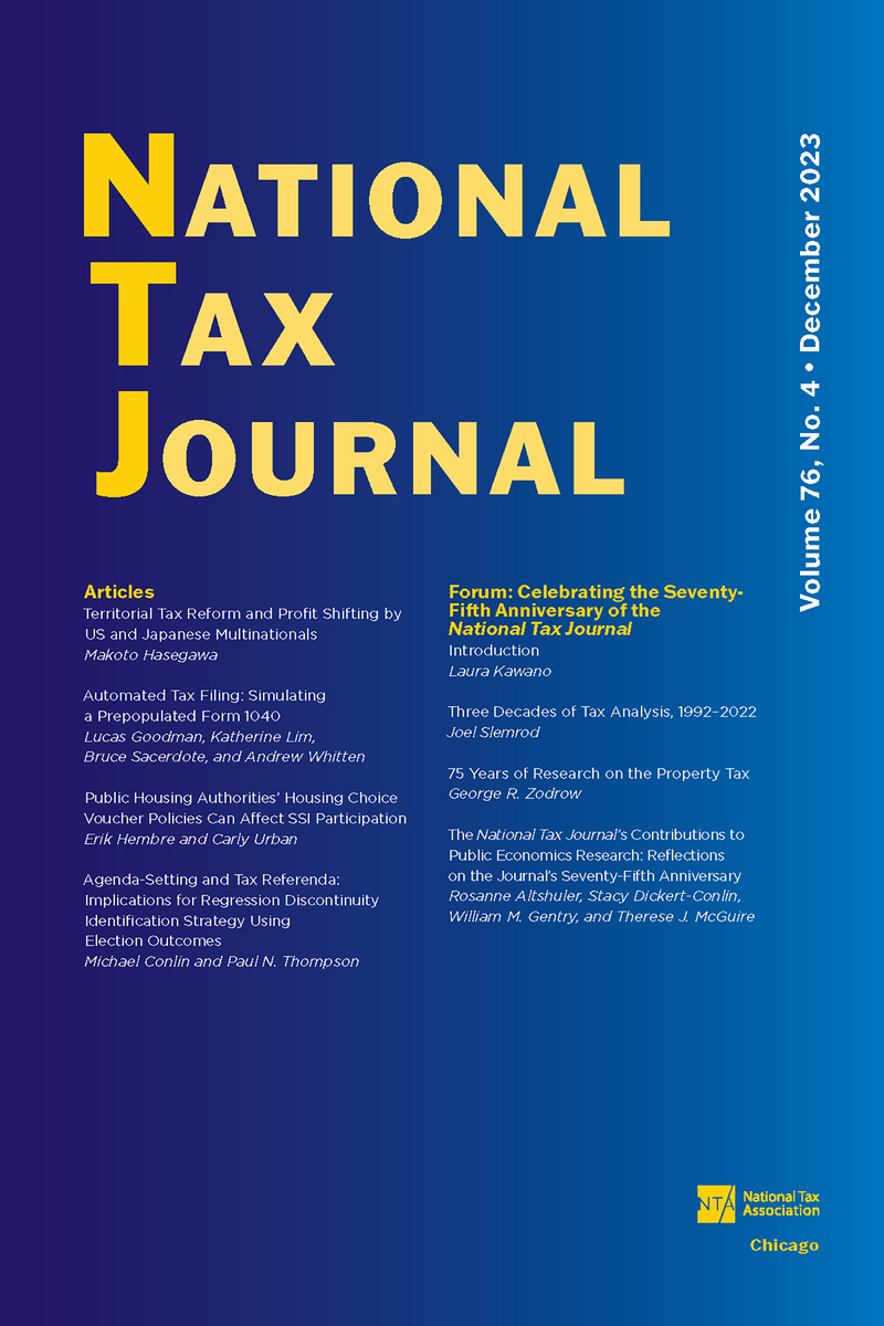 ABOUT THIS BOOKThis is volume 76 issue 4 of National Tax Journal. The goal of the National Tax Journal (NTJ) is to encourage and disseminate high quality original research on governmental tax and expenditure policies. The journal publishes peer reviewed articles that include economic, theoretical, and empirical analyses of tax and expenditure issues with an emphasis on policy implications. Each issue includes a Forum, which consists of invited papers by leading scholars that examine in depth a single current tax or expenditure policy issue. The NTJ has been published quarterly since 1948 under the auspices of the National Tax Association (NTA).