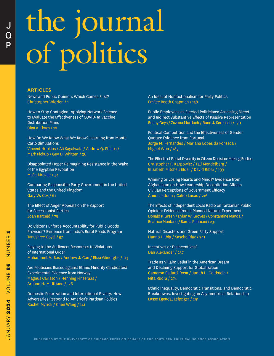 ABOUT THIS BOOKThis is volume 86 issue 1 of The Journal of Politics. Established in 1939 and published for the Southern Political Science Association, The Journal of Politics is a leading general-interest journal of political science and the oldest regional political science journal in the United States. The scholarship published in The Journal of Politics is theoretically innovative and methodologically diverse, and comprises a blend of the various intellectual approaches that make up the discipline. The Journal of Politics features balanced treatments of research from scholars around the world, in all subfields of political science including American politics, comparative politics, international relations, political theory, and political methodology.