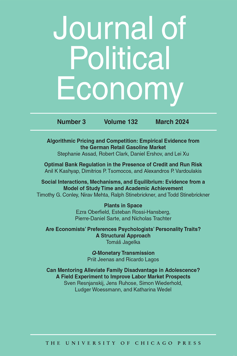 ABOUT THIS BOOKThis is volume 132 issue 3 of Journal of Political Economy. One of the oldest and most prestigious journals in economics, the Journal of Political Economy presents significant and essential scholarship in economic theory and practice. The journal publishes highly selective and widely cited analytical, interpretive, and empirical studies in a number of areas, including monetary theory, fiscal policy, labor economics, development, microeconomic and macroeconomic theory, international trade and finance, industrial organization, and social economics.