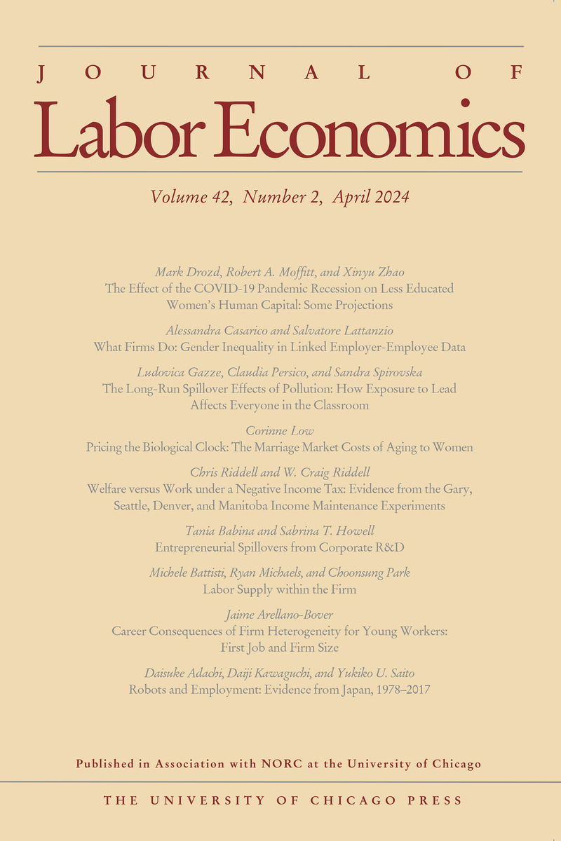 ABOUT THIS BOOKThis is volume 42 issue 2 of Journal of Labor Economics. Founded in 1983 as the first journal devoted specifically to labor economics, the Journal of Labor Economics (JOLE) presents international research on issues affecting social and private behavior, and the economy. JOLE’s contributors investigate various aspects of labor economics, including supply and demand of labor services, personnel economics, distribution of income, unions and collective bargaining, applied and policy issues in labor economics, and labor markets and demographics.