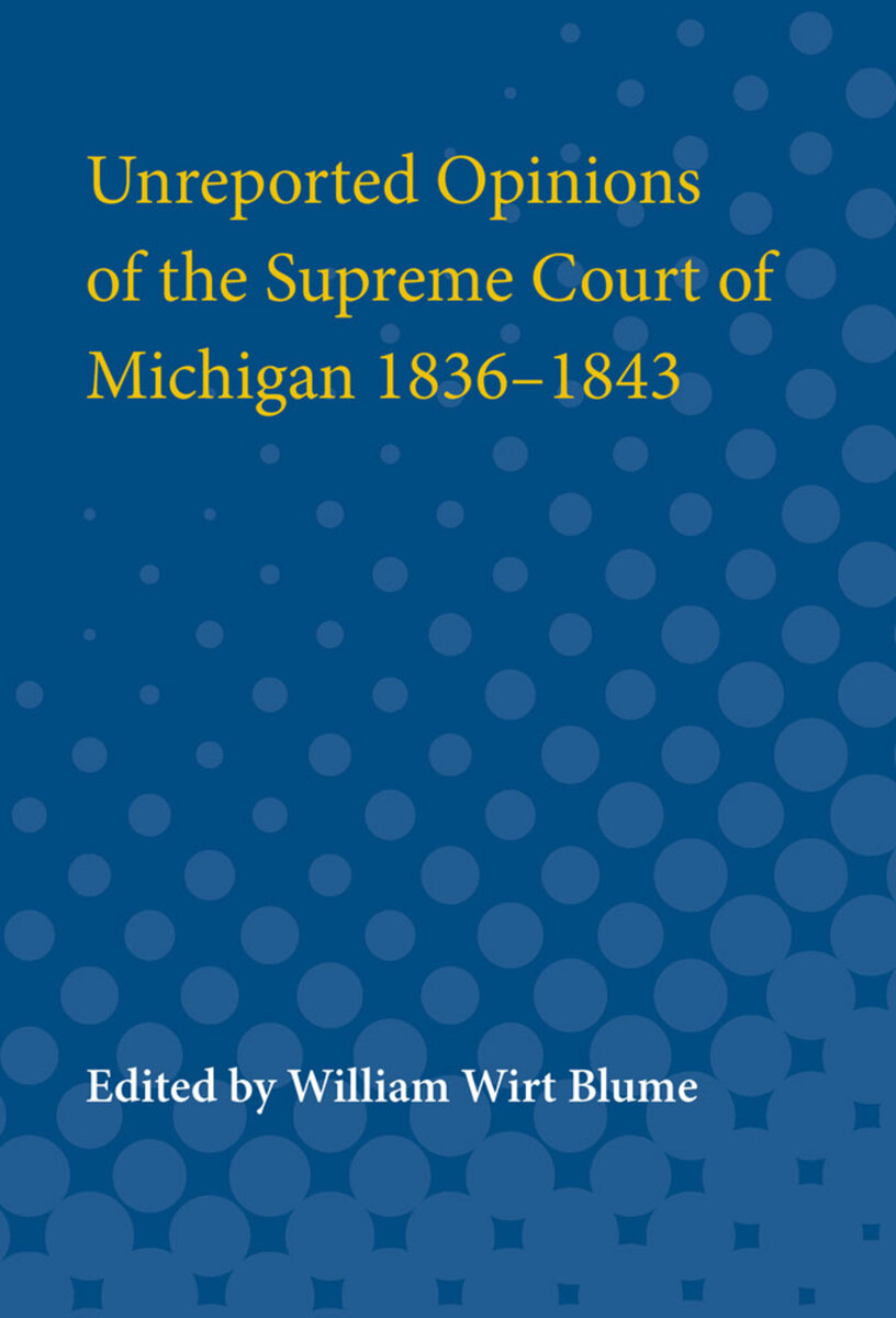 ABOUT THIS BOOKThose who are interested in the judicial history of Michigan prior to 1863 are fortunate in having access to much of such history contained in the six volumes entitled Transactions of the Supreme Court of Michigan, edited by William Wirt Blume of the Michigan Law School faculty. In Unreported Opinions of the Supreme Court of Michigan 1836–1843, Blume brings to light and for the first time makes accessible the Michigan Supreme Court decisions that were rendered during the seven years from 1836 to 1843. The volume includes seventy of the opinions of the Michigan Territorial Court during this time period, along with other interesting material.