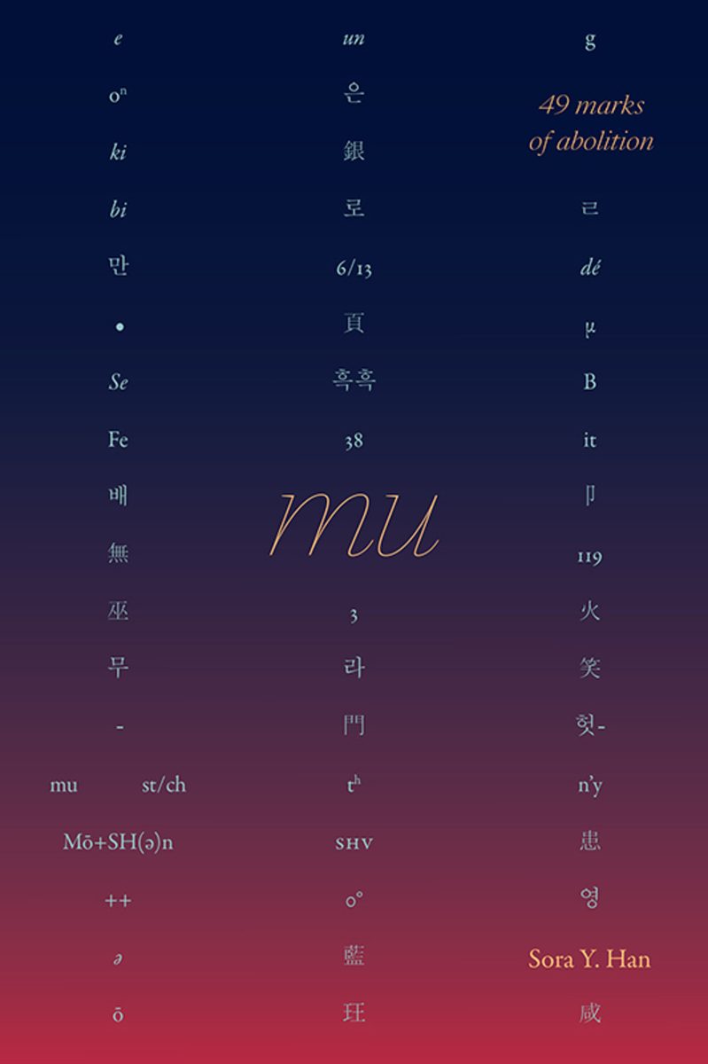 ABOUT THIS BOOKIn March 2020, Sora Y. Han learned her father was dying of cancer just as the COVID-19 pandemic arrived on California's shores. These two events led Han to introspection: “Who have I been writing to?” and “Who have I been writing for?” In her observance of the 49 days of mourning in Buddhist tradition, answers come in the form of mu – no thing, nothingness. Han’s poetic meditations on freedom struggle come alive in the empty spaces between words, letters, and pictograms spanning her many languages—English, Korean, Chinese, jazz, law, and poetry. Transliterating and dystranslating the writings of Fred Moten, Theresa Hak Kyung Cha, Jacques Lacan, Frantz Fanon, and others through the Korean alphabet, Han weaves the DMZ, Betty’s Case, the Thirteenth Amendment, Afro-pessimism, and psychoanalytic desire together into the open field of Bay Area radicalism. Mu is both a loving homage to and a playful subversion of political inheritances and the unsayable beyond law.