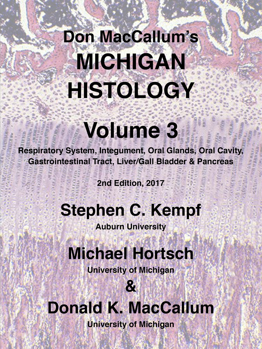 http://histology.sites.uofmhosting.net Volume 3 of this 4 Volume lab manual set is concerned with the Histology of human tissues. It covers Respiratory System, Integument, Oral Glands, Oral Cavity, Gastrointestinal Tract, Liver, Gall Bladder, and Pancreas with a descriptive text and pictures.